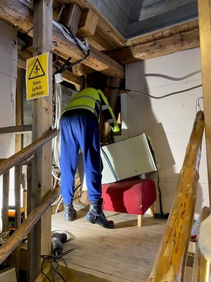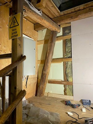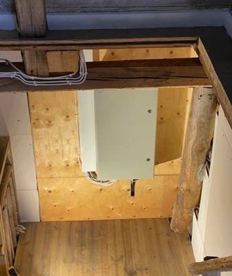 Vanha sähkökaappi jouduttiin irrottamaan ja sen takaseinä korjaamaan, lämpöeristämään sekä kaapin kiinnitykset vahvistamaan. Alueen siivoamiseenkin meni aikaa, koska työ ei ollut aivan pieni, vaikkakaan muutosten myötä ei tarvinnutkaan asentaa kahta pienempää ryhmäkeskusta. Syöttökaapelien vedot muuttuivat merkittävästi.