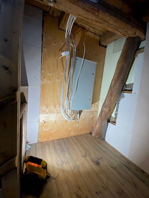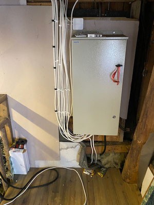 Jouduimme ostamaan uuden sähköpääkeskuksen. Vanha sähkökaappimme jäi jakokeskukseksi. Sen myötä tuli yllätyksenä, että se pitääkin uusien säännösten mukaan kiinnittää ulos, minne pääsee tarvittaessa pelastuslaitos käsiksi. Sähkötyöt teetettiin Saipu Oy:llä. Timpurinhommat teimme itse taloilla. Samoin talkoilla teimme mm. läpiviennin ea-koppiin, minne invertteri sijoittui. Samalla teimme uudestaan kunnon maadoitukset Mannin Navetalle.