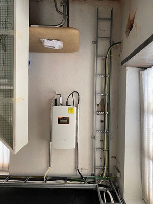 Aurinkovoimalan asennuksen yhteydessä jouduimme muuttamaan pääsähkökaapin paikkaa. Uusien säädösten mukaan pääsähkökaappi tulee sijoittaa siten, että pelastuslaitos tulee päästä katkaisemaan tarvittaessa siitä sähköt. Näin ollen emme hankkineetkaan alkuperäisen suunnitelman mukaan pientä sähkökaappia, vaan yhden uuden isomman lukittavan sähköpääkeskuksen. Tämä muutti myös invertterin sijaintia. Se vaihdettiin ensin suunnitellusta yläkerran varaston seinästä alas ns. ea-kopiin (on lukittu tila), koska johtojen järkevän vetämisen myötä vanha sijainti ei olisi ollut enää mahdollinen. Tämän vuoksi vanha pääkeskus jäi palvelemaan sähkönjakamista sisällä eikä pientä ryhmäsähkökeskusta tarvinnut hankkia. Saamme sähköt jakautumaan eri puolille Mannin Navettaa tasaisemmin hyvin näinkin.
