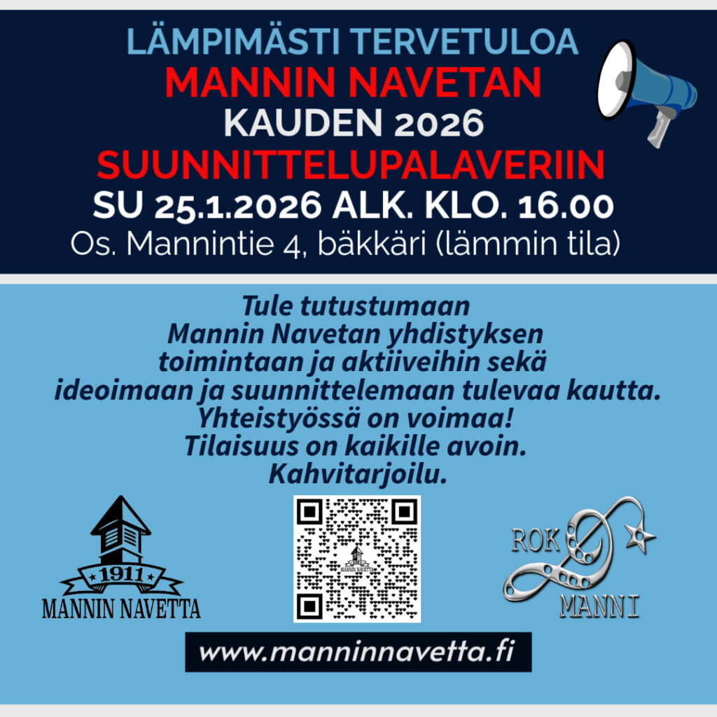 Lämpimästi tervetuloa Mannin Navetan kauden 2026 suunnittelupalaveriin, joka pidetään sunnuntaina 25.1.2026 alkaen klo 16.00. Osoite Mannintie 4, bäkkäri (lämmintä tilaa).